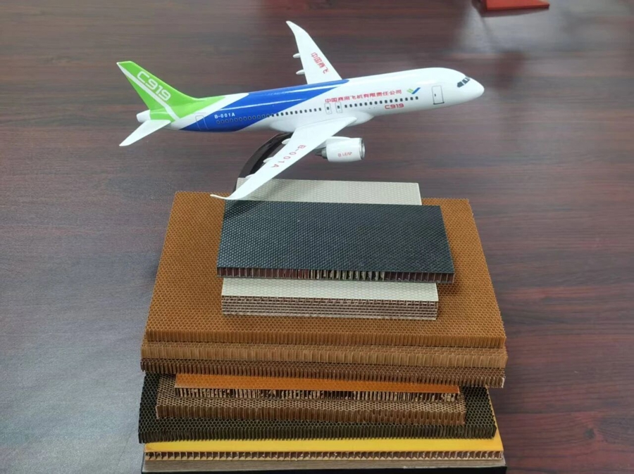 图说:芳纶蜂窝材料和大飞机模子。