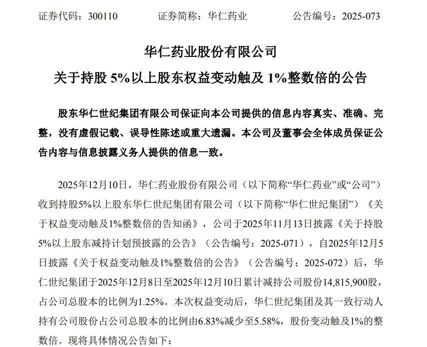 12月10日晚间,华仁药业(300110)发布公告,推动华仁世纪集团有限公司于2025年12月8日至2025年12月10日累计减捏公司股份1482万股,占公司总股本的比例为1.25%。